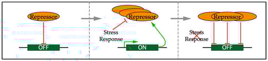 Schematic showing a general network wiring consisting of a stress response inhibiting a negative feedback loop and a repressor with the capacity to repress its own transcription. This would allow for rapid down-regulation of transcription and fast changes in the proteome during the recovery from the stress response.