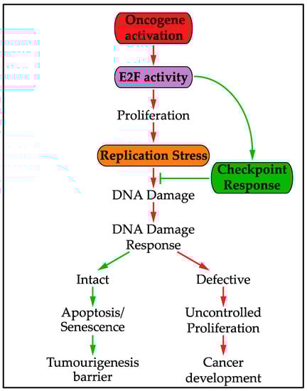 DNA replication stress can be induced by oncogene activation or tumour-suppressor inactivation. This oncogene-induced replication stress has been extensively reviewed previously [,,]. Oncogene-induced replication stress has recently been proposed as a hallmark of cancer as a very early event in tumourigenesis [,,,]. Oncogene-induced replication stress is thought to induce DNA damage, with the DNA damage response (reviewed in [,]) acting as an initial barrier to tumourigenesis through oncogene-induced senescence or apoptosis [,,]. Replication stress-induced DNA damage is thought to drive mutations that bypass the DNA damage checkpoint and therefore allow continued tumour progression []. As such, oncogene-induced replication stress has a key role in the evolution of cancer [] and understanding the response to replication stress has important implications in enhancing our knowledge of cancer development.