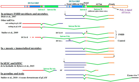 A major difficulty in the study of endogenous DUX4 gene expression is the very low abundance, high GC content and rapid turnover of its mRNAs. Despite these challenges, investigators of different groups have characterized several transcription starts sites, alternative splicing and use of polyadenylation signals, as well as additional exons in the 3’ untranslated region (3’ UTR) in different cell types. Some of these variations result in the expression of DUX4 protein forms either shorter [22,23] or extended on the amino-terminus [70] as compared to the bona fide 424-residue protein described in muscle cells. In Figure 1 we have summarized the different characteristics of these DUX4 mRNAs.