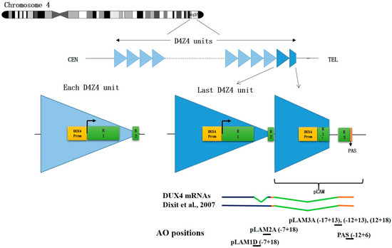 D4Z4 repeat array on chromosome 4 and antisense oligonucleotide positions. Top: Each D4Z4 repeated unit contains a promoter and an open reading frame (ORF) for DUX4 in the first exon (E1) and a short non-coding exon 2 (E2). On a 4qA permissive allele, the last D4Z4 unit is extended by a pLAM region providing intron I, an untranslated exon 3 (E3) and a polyadenylation signal (PAS) allowing for DUX4 mRNA stabilization and subsequent translation in DUX4 protein. Healthy individuals present 11–100 D4Z4 units while patients with FSHD1 only have 1–10 units. Bottom: Positions of the antisense oligonucleotides (AOs) described in this review. They are all designed for splicing interference except for PAS that affects mRNA polyadenylation.