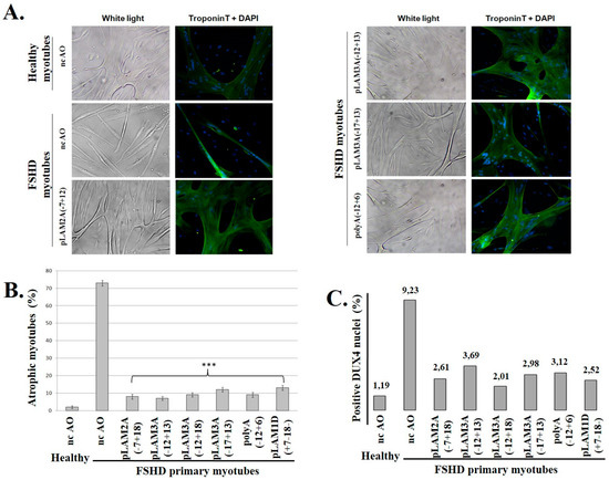 Treatment of FSHD myoblasts with antisense oligonucleotides against DUX4 prevents the formation of myotubes with the atrophic phenotype. (A) Primary healthy or FSHD myoblasts were transfected with either the negative control AO (nc-AO) or the indicated AOs targeting DUX4 mRNAs (AO positions shown in Figure 2), and differentiation was induced 4 h later. After 8 days, cells were observed under white light before processing to detect troponin T through immunofluorescence (green). The nuclei were stained with DAPI; (B) The efficacy of the AOs used in (A) and two additional ones was evaluated based on the proportion of atrophic myotubes (caused by DUX4 expression, and observed in the ncAO-treated cells) in the culture. Myotubes were counted from at least 10 random fields: those with a width <20 µm were considered “atrophic”. The percentage of atrophic to total myotubes is expressed as the mean ± SD; (C) DUX4 was detected by immunofluorescence (MAb 9A12; not shown). The number of DUX4-positive nuclei was counted in 10 fields in healthy control or FSHD myoblast cultures following treatment with the indicated AOs. The percentage of DUX4-positive nuclei among total nuclei (DAPI staining) was calculated and is reported in the graph. The significance of the differences between experiments with each individual AO compared to the ncAO, was evaluated using Student’s t-test. *** p-value < 0.001.