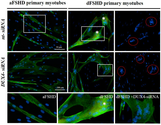 We transfected these myoblasts with short inhibitory RNAs, either DUX4 siRNA or a negative control siRNA (nt) and switched the culture to differentiation medium. Eight days later, the myotube morphology was highlighted through immunofluorescence staining of troponin T, a cytoplasmic marker of muscle differentiation. As expected, aFSHD myoblasts differentiated into atrophic myotubes in the presence of negative control siRNA. In contrast, the myotubes that formed after treatment with DUX4 siRNA (Figure 4, left panels) were enlarged. Similar suppression of the atrophic myotube phenotype was previously observed using this siRNA in healthy myoblasts transfected with a DUX4 expression vector [27]. However, in the presence of either negative control or DUX4 siRNA, dFSHD myoblasts differentiated into disorganized myotubes with large clusters of myonuclei (Figure 4, right panels), suggesting that this abnormal phenotype did not result from DUX4 expression.