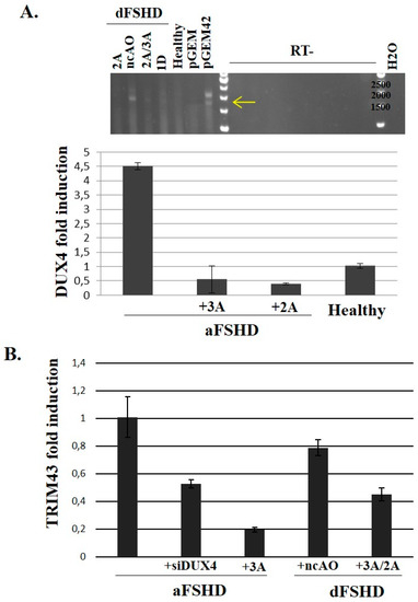 Evaluation of DUX4-AO efficiency on endogenous DUX4 and target mRNA expression in FSHD primary myotubes. 105 primary myoblasts (control, aFSHD and dFSHD) were seeded in 35 mm culture dishes. The next day, cells were transfected with either the negative control AO (nc-AO, 600 nM) or AOs pLAM2A(−7 + 18) and pLAM3A(−12 + 13) either alone (lanes 2A or 3A) or in a cocktail (lane 2A/3A) and pLAM1D(+7 − 18) (lane 1D) at previously determined optimal concentrations. Differentiation was induced 4 h after transfection and the cells were harvested 72 h later. (A) Top: Total RNAs of dFSHD myotubes were extracted and submitted to RT-PCR with primers we had previously shown to be specific of the DUX4 full length ORF [19]. The RT-PCR products were separated by electrophoresis on an agarose gel and stained with ethidium bromide. The controls were total RNAs of C2C12 cells transfected with the pGEM plasmid either without insert (negative control) or with a genomic fragment containing 2 D4Z4 units [18] (pGEM42). The experiment was done in the presence (RT+) or absence (RT-) of retrotranscriptase to demonstrate the products did not result from amplification of contaminating genomic DNA. Bottom: Total RNAs of aFSHD myotubes were extracted and submitted to reverse transcription (RT) and amplification by qPCR with DUX4-specific primers. The relative abundance was calculated using Ribosomal Protein Lateral Stalk Subunit P0 (RPLPO) as a reference for cDNA input and following M. Pfaffl’s guidelines [68,69]. The data are presented as fold change in DUX4 mRNA abundance with or without AO treatment; (B) Fold change in TRIM43 mRNA abundance after treatment with an AO or siRNA against DUX4 mRNA. The RT-qPCR was performed as described [67].