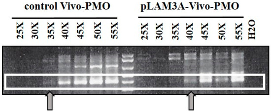 Two mice were injected in the Tibialis anterior (TA) with rAAV-D4Z4/pLAM virus (described in [84]) and pLAM3A vivo-PMO (Figure 2) directed against the DUX4 mRNA. For negative controls we similarly injected two mice with rAAV-D4Z4/pLAM and a vivo-PMO targeting human beta-globin mRNA. The mice were sacrificed 10 days later, their TAs collected, and total RNAs were extracted with Trizol. DUX4 mRNAs were amplified by reverse transcription (RT) followed by a nested PCR (primer sequences in [84]). An electrophoresis of the RT-PCR products on agarose gel yielded a band at the expected 450-bp length for the TAs injected with control vivo-PMO (Figure 6). For the TAs injected with pLAM3A vivo-PMO the 450-bp band was present but at a lower intensity. In a semi-quantitative analysis this band could be detected after 35 PCR cycles for the TA treated with the control vivo-PMO but only after 40 cycles for the TA treated with pLAM3A vivo-PMO, suggesting a 30 (25) fold difference in abundance. In contrast, when a similar experiment was performed with PMOs, no decrease in DUX4 mRNA could be observed. Those preliminary data suggest that pLAM3A vivo-PMO prevents DUX4 toxic protein expression by causing DUX4 mRNA degradation in vivo.
