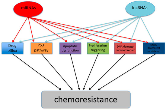 Since the influences of ncRNAs in the main facets of cancer development are described in great detail within the scientific literature, this review specifically places a spotlight on the emerging global research efforts that (in the authors’ opinion) most effectively recognize the growing link pertaining to non-coding RNA activities with the regulation of cancer chemoresistance properties [2,3,4,5,6].