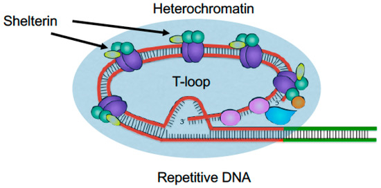 Telomeres are the physical ends of eukaryotic chromosomes. They provide a mechanism for full replication of the chromosomal ends while protecting these ends from DNA degradation and recombination. At the same time, several telomeric features pose challenges to the replication machinery (Figure 1). At telomeres, replication forks proceed in a unidirectional manner from a centromere-proximal origin [7,8]. Although some later reports suggest that replication could also be initiated within the telomeric repeats [9,10,11], the unidirectional nature of telomere replication may present a problem for complete replication of chromosomal ends [12]. Furthermore, the repetitive nature of their DNA sequence, the presence of heterochromatin proteins and chromatin remodeling marks, and the potential to form T-loop structures make telomeres difficult-to-replicate templates for DNA replication (Figure 1).