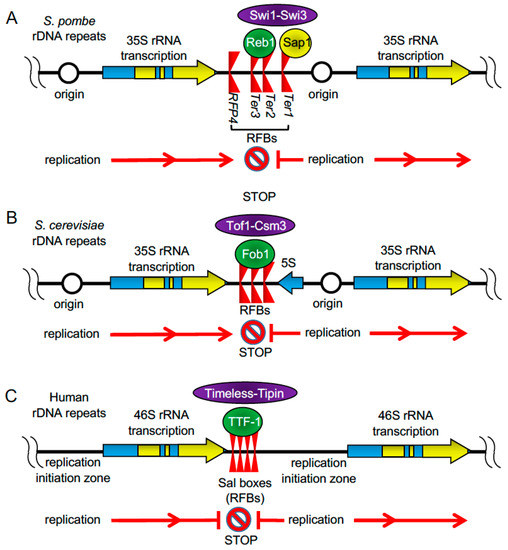 A significant volume of research focused on understanding genome stability at rDNA repeats has been carried out using S. pombe. The S. pombe genome contains 100–150 copies of rDNA repeats at the ends of chromosome III. Each 10.9-kb repeat unit is composed of the 35S rDNA transcriptional unit and a non-transcribed region that contains an origin of replication (ori3001) and four closely spaced polar replication barriers (Ter1/RFB1, Ter2/RFB2, Ter3/RFB3 and RFP4) that block replication forks moving in opposite direction to the transcription machinery (Figure 2A) [38,39,40]. A group of factors is involved in fork pausing at Ter1–3. In contrast to Ter1–3, no trans-acting factor has been identified for RFP4, and this barrier is not functional when placed in a plasmid [41]. Two-dimensional gel electrophoresis analysis demonstrated that, in the absence of Reb1, Swi1, or Swi3, the intensity of fork-pausing signal increases at RFP4. This suggests that pausing at RFP4 may be a consequence of replication and transcription machineries colliding at RFP4 when the three main barriers (Ter1–3) fail to pause the replication fork [39].