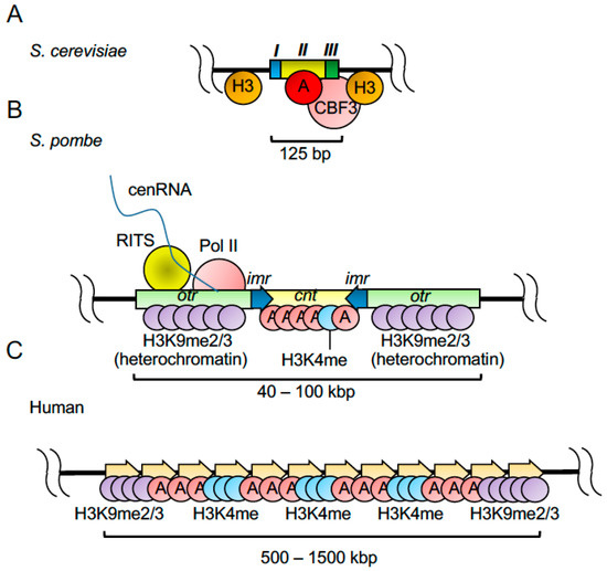 Centromere structures in S. cerevisiae, S. pombe, and humans. (A) Budding yeast has point centromeres, which are comprised of a 125 bp DNA sequence containing centromere DNA elements I (CDEI), II (CDEII), and III (CDEIII). The CBF3 complex binds to CDEIII and is involved in fork pausing at centromeres. (B) Fission yeast has regional centromeres, which consist of 40 to 100 kb DNA sequences including outer repeats (otr), inner repeats (imr), and the central core centromeric sequence (cnt). Pericentric heterochromatin at outer repeats presents histone H3 lysine 9 di- and tri-methylation and may cause fork pausing. RNAi-mediated silencing pathways are involved in releasing RNA polymerase II to maintain replication fork structure at centromeric regions. (C) Human centromeres contain alpha satellite repeats and recruit histone CENP-A. Other human centromere features include histone H3 lysine 9 di/tri-methylation and H3 lysine 4 mono-methylation.