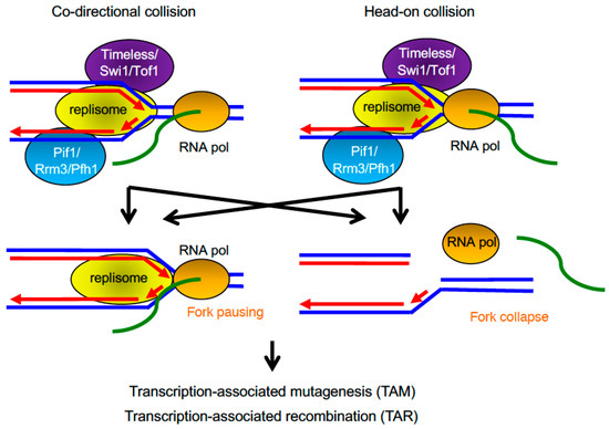 Transcription–replication encounters can occur when the transcription and the replication machineries move in the opposite direction and converge upon each other (head-on collision). Because these machineries have different velocities, collision also occurs when the two machineries move in the same direction (co-directional collision) (Figure 7). Studies in E. coli and S. cerevisiae show that transcription impedes replisome progression, resulting in the arrest of replication forks [191,192,193]. Activation of DNA damage response pathways, elevated mutagenesis, and chromosomal instability at actively transcribed loci suggest that replication forks also collapse upon encountering the transcription machinery (Figure 7) [194,195].