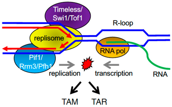 Several replication factors have been shown to play a specific role during replication of highly transcribed regions. The S. pombe Pfh1 helicase is required for efficient fork movement at highly transcribed RNA polymerase II-dependent genes and at other difficult-to-replicate regions such as rDNA loci. Because cells depleted of Phf1 are unviable in the absence of Swi1, accumulated stalled forks in the Pfh1 mutant cells may need to be stabilized by Swi1 for survival [223]. In relation to this idea, in budding yeast, roles of the Swi1/Timeless homolog, Tof1, and its partner, Csm3, were investigated for replisome protection at a RNA Pol III-dependent transcription site in a plasmid. Replication fork pausing is greatly attenuated in the tof1∆ mutant and significantly enhanced in the rrm3∆ mutant. Rrm3 is a member of the Pif1 family of helicases in budding yeast. Deletion of both tof1 and rrm3, restores pausing to a level significantly higher than that of the wild-type cells [68]. Furthermore, Timeless–Tipin homologs in S. cerevisiae, S. pombe, and humans control the RFBs of rDNA genes in order to prevent collisions between transcription and replication complexes during ribosomal gene transcription [39,65,68,224], suggesting the general role of Timeless–Tipin in preventing genome instability at the interface of DNA replication and transcription (Figure 7).