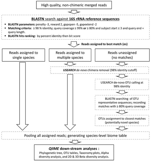 - Al-Hebshi, N.N.; Nasher, A.T.; Idris, A.M.; Chen, T. Robust species taxonomy assignment algorithm for 16S rRNA NGS reads: Application to oral carcinoma samples. J. Oral Microbiol. 2015, 7, 28934. [Google Scholar] [CrossRef] [PubMed]