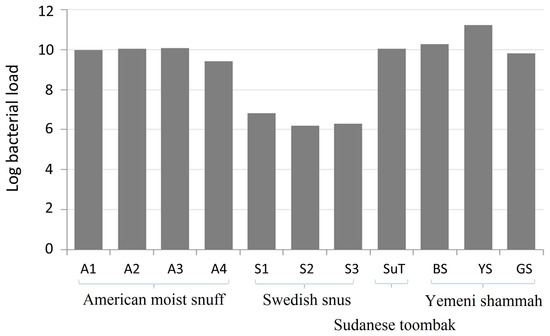 Bacterial load of the smokeless tobacco (ST) products expressed as log10-transformed 16S rRNA gene counts per gram. Quantification was performed using quantitative polymerase chain reaction (qPCR) in triplicate.
