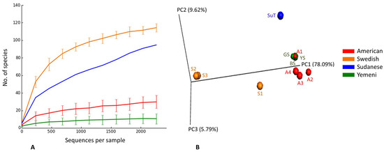 The observed and expected number of species (Chao1), Shannon index (α-diversity) and Good’s coverage, calculated by rarefaction based on the sample with lowest read count (2265 reads) are presented in Figure 3 (results for individual samples shown in Supplementary Figure S1). The observed species richness and diversity were highest for the Swedish snus and lowest for the Yemeni Shammah. SuT showed the highest expected number of species (Chao1) but the lowest Good’s coverage, which is consistent with the rarefaction curves (Figure 4A): by extrapolation, an additional 2000 reads would have been required to obtain a coverage of 0.99 (saturation) for SuT. The result of principle component analysis (PCoA) based on weighted UniFrac is presented in Figure 4B. Each tobacco type formed a separate cluster, with the exception of the American A1 that clustered with the Yemeni shammah, and the Swedish S1 that fell between the American and other Swedish products. Grouping was found to be statistically significant by Analysis of Similarities (ANOSIM; p = 0.01).