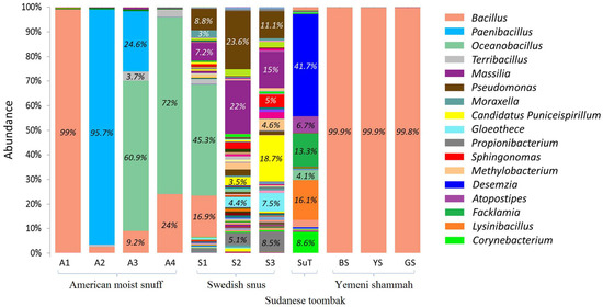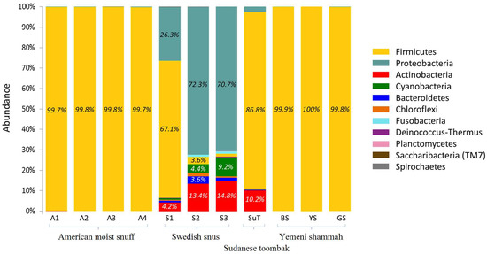 As expected, the Swedish snus harbored far lower bacterial counts than the other products, which is consistent with the fact that Swedish snus products are subject to pasteurization during their manufacturing process, and also explains the low levels of TSNAs present in them [41]. A considerable proportion of the quantified DNA in the Swedish sample possibly represented non-viable bacteria. The Yemeni YS had the highest microbial load. The levels of TSNAs in Yemeni shammah have not been yet established, but can be assumed to be high in view of the strong association between shammah use and oral cancer [8,10]. The American, Sudanese, and Yemeni products had comparable bacterial loads. However, studies indicate that they significantly vary with respect to their TSNA content [42]; SuT in particular has very high concentrations of TSNAs [43]. Obviously then, the levels of TSNAs in ST products differ not only as function of total microbial load but probably also as a function of microbial community composition. Indeed, a very recent study has found the TSNA concentrations in tobacco leaves to correlate positively with the proportions of Firmicutes and inversely with those of Proteobacteria [20]. Interestingly, Firmicutes was the predominant phylum in the American, Sudanese, and Yemeni products in this study, while Proteobacteria was the major phylum in the Swedish products.