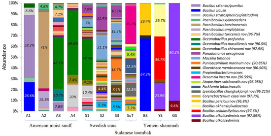 Figure 7 illustrates the species-level bacteriome of each of the ST products. A total of 491 species-level taxa were identified, of which 66 had a relative abundance of ≥1% (Supplementary Table S3). The number of species per sample ranged from 10 to 23 for the Yemeni shammah, 28 to 43 for the American snuff, and 121 to 139 for the Swedish snus; 95 were detected in SuT. The most abundant species in the American products were Bacillus safensis/pumilus (A1 and A3), Bacillus stratosphericus/altitudinis (A1 and A4), Bacillus clausii (A1), Paenibacillus barcinonensis (A2), and Oceanobacillus profundus (A3 and A4). The predominant species in the Swedish varieties S2 and S3 were Pseudomonas aeruginosa, Massilia timonae, Propionibacterium acnes in addition to two potentially novel species with no close relatives: the closest species were Puniceispirillum marinum (90.85%) and Gloeothece membranacea (86.56%). S1 harbored a mixture of the species found in A4 and those identified in S2 and S3. In SuT, Facklamia tabacinasalis in addition to three potentially novel species close to Desemzia incerta (96.59%), Atopostipes suicloacalis (96.98%), and Lysinibacillus chungkukjangi (96.21%) accounted for the majority of the bacteriome. The composition of the bacteriome varied significantly across the Yemeni samples. BS primarily contained Bacillus clausii and a novel species close to Bacillus persicus (96.8%), while YS harbored Bacillus okhensis/wakoensis and two novel species close to Bacillus cellulosilyticus (97.6%) and Bacillus alkalisediminis (97.59%). The latter novel species made the majority of the bacteriome of GS. To demonstrate reproducibility of sequencing, we carried out comparison of bacterial species profile obtained from two sequencing runs carried one year apart for four of the samples (see Supplementary Figure S4).