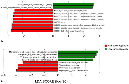 Differentially enriched functions. Linear Discriminant Analysis Effect Size (LEfSe) analysis showing genes (A) and pathways (B) that were significantly differentially enriched between the low and high carcinogenicity groups (showing those with LDA score ≥2.5).