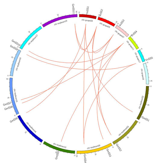 Grape SS genes were mapped to chromosomes by identifying their chromosomal locations based on information available at the Grape Genome Database (CRIBI. Available online: http://genomes.cribi.unipd.it/grape/, V2.1). The segmental and tandem duplication regions, as well as chromosomal location, were established using PLAZA (PLAZA. Available online: http://bioinformatics.psb.ugent.be/plaza/versions/plaza_v3_dicots/, v3.0 Dicots). For syntenic analysis, synteny blocks within the grape genome and between grape and soybean genomes were downloaded from the Plant Genome Duplication Database and visualized using Circos (Circos. Available online: http://circos.ca/).