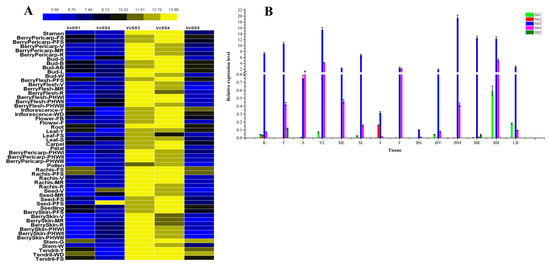 Microarray gene expression profiles of the different organs of grapevine at various developmental stages were downloaded from Gene Expression Omnibus (GEO, available online: https://www.ncbi.nlm.nih.gov/geo/) under the series entry GSE36128. The expression data obtained from the V. vinifera cv. “Corvina” (clone 48) expression atlas were normalized based on the mean expression value of each gene in all tissues/organs analyzed.