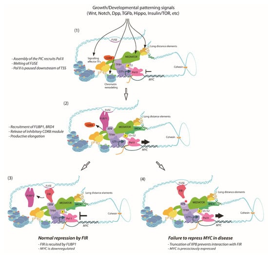 FIR therefore blocks FUBP1-dependent MYC activation by decreasing XPB helicase activity, to permit only basal transcription []. The MYC promoter integrates multiple signaling inputs, but regulation by TFIIH at the level of promoter clearance would provide an opportunity to control transcription post-initiation. Repression of TFIIH by FIR, late in the transcription cycle, would provide an additional regulatory mechanism to safeguard against inappropriate or excessive signal-induced MYC activation. In context with the post-initiation block controlling MYC transcription [,,], FIR could encumber TFIIH release, enable Pol II pausing and delay the subsequent progression to elongation. Indeed, FIR is an essential MYC repressor, as FIR knockdown is associated with MYC dysregulation ex vivo [] and loss-of-function FIR mutations are associated with colorectal cancer displaying increased MYC abundance [].