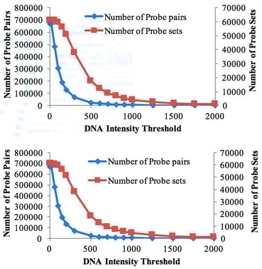 Retained probe-sets and probe-pairs at different threshold values.