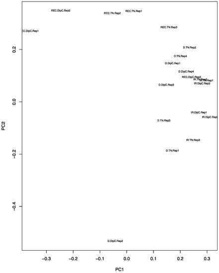 Principal component analysis (PCA) plot of the expression data from the microarrays. The principal components PC1 and PC2 values for each chip have been placed on a scatter plot. Each chip result is defined by a three-part character string consisting of the treatment, genotype, and replicate number. IR, D, and REC refer to water-sufficient, water-limited, and recovery treatment, respectively; the genotypes are DipC and TN; and Rep1–4 refers to the specific biological replicate. Note, the water-sufficient and recovery treatments have only three replicates, while dehydration has four.