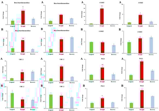 Comparison of qPCR and microarray intensity values: Rows (A) and (B) respectively refer to results for DipC and TN. The left- and right-hand pairs of columns correspond to the qPCR and microarray values for DipC and TN, respectively. The gene under study is named at the top of each panel. In order, the investigated genes are Beta-fructofuranosidase, COMT, UBC-2, and PAL1. qPCR and Microarray values are shown as fold changes with respect to the water-sufficient treatment (Irrigated). Error bars denote the standard error. Single and double asterisks indicate that p-value is less than 0.05 and 0.01, respectively, which was assessed by the paired t-test between groups. Irrigated and Drought refer to water-sufficient and water-limited treatments, respectively.
