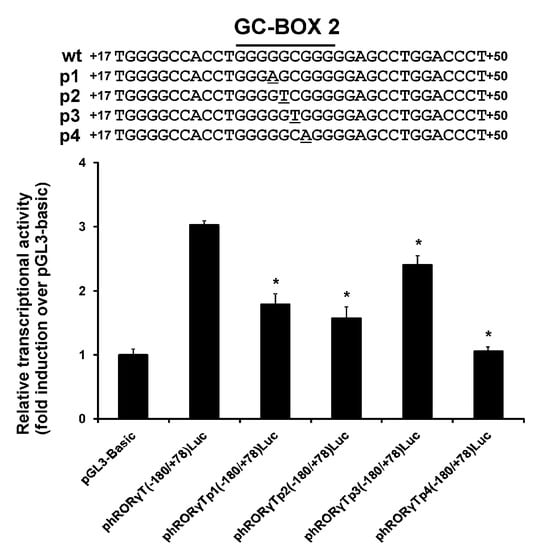 Effect of introduced polymorphisms of GC-box2 on the activity of the RORγT proximal promoter in Jurkat cells; phRORγT(−180/+78)Luc contains the wild-type sequence (wt), whereas phRORγTp1(−180/+78)Luc (rs774872314), phRORγTp2(−180/+78)Luc (rs116171003), phRORγTp3(−180/+78)Luc (rs200231898), and phRORγTp4(−180/+78)Luc (rs201107751) contain the mutated sequence. The results shown are from two independent transfections, each performed in triplicate. *Significantly different from the wild type vector (p < 0.001; n = 6).