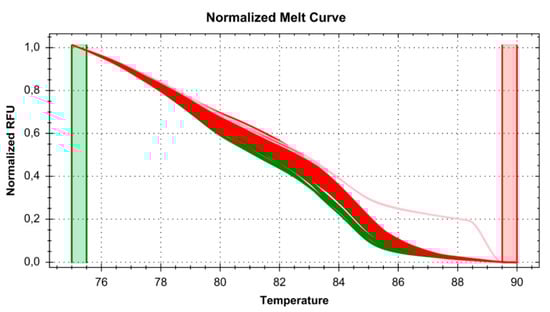 The single standard reaction mixture (10 µL) was prepared using the Janus® Automated Workstation (Perkin Elmer Inc., Waltham, MA, USA). The mixture was composed of 2×GoTaq® Colorless Master Mix (Promega, Madison, WI, USA), 10×LC Green Plus® dye (BioFire Defense Inc., Salt Lake City, UT, USA), 0.5 µL of 10 µM primers (f, 5′-GTGAATGGGGCCACCTG-3′; r, 5′-GACGACAGGGTCCAGGCT-3′), and 3 µL of DNA (200 pg/µL), and filled with 0.5 µL of water to the final volume. The reaction was performed on a 384-well microplate using the CFX384™ real-time PCR system (Bio-Rad Laboratories Inc., Hercules, CA, USA) (all samples were duplicated). The reaction conditions were as follows: initial denaturation at 95 °C for 3 min, 50 amplification cycles of denaturation at 95 °C for 20 s, and annealing at 60 °C for 30 s. The plate was read after each cycle. Directly afterwards, the melting curve was determined by incubating the plate at 90 °C for 60 s and 40 °C for 60 s, and increasing from 65 °C to 95 °C (in 0.2 °C increments) for 10 s while reading the plate. The obtained data were analyzed with the Bio-Rad Precision Melt Analysis Software, version 1.2 (Bio-Rad Laboratories Inc.).