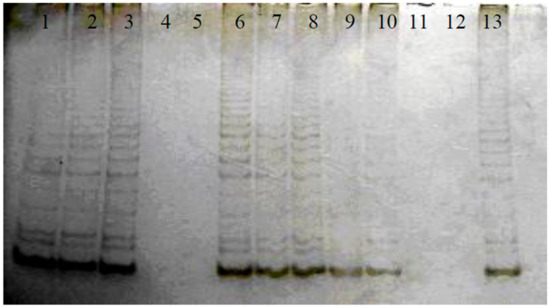 The effect of isolated compounds on telomerase activity. Lane 1: telomerase positive control cell(K-562); Lane 2: 0.5 μL of DMSO; Lane 3: negative control (lysis buffer substituted test samples); Lane 4: telomerase heat inactive cell lysate; Lane 5: anti-cancer drug cis-platinum; Lane 6: anti-cancer drug taxol; Lane 7: anti-cancer drug HCPT; Lane 8: ATRA; Lane 9: ethyl acetate extract of red yeast rice; Lane 10: monacolin K; Lane 11: monacolin L: Lane 12: rubropunctatin; Lane 13: positive control cell (K-562).