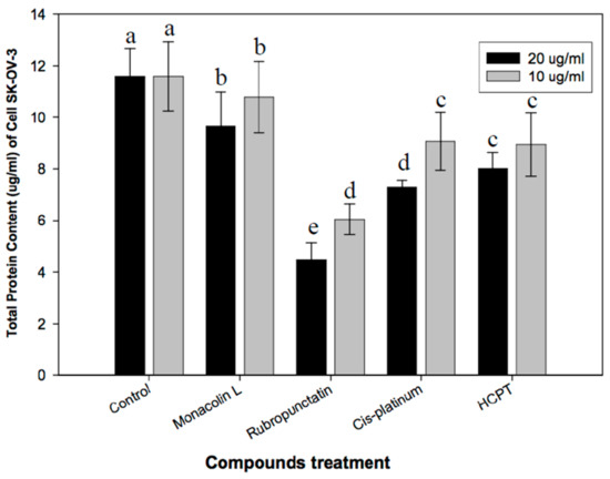 Protein content of cancer cell line SK-OV-3 treated by compounds. The same letters above the graphic bars within the same concentration group indicate no significant (p < 0.05) difference between different treatments.