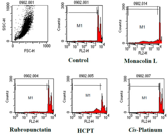 Flow cytometric quantification of apoptosis cells within the PI stained population was measured by FACS analysis. The cells with a higher percentage of M1-gated DNA content as compared to control one represents apoptotic cells.
