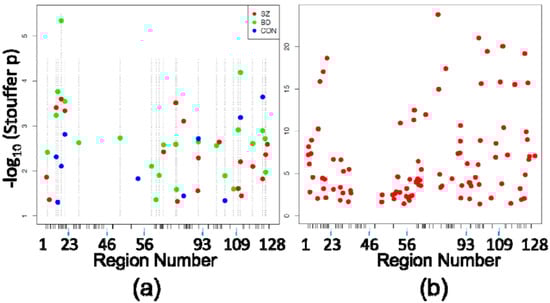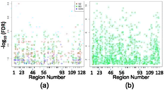 Differentially Methylated Positions (DMPositions) in CA1 vs. CA3. (a) Shown are the DMPositions identified within each eight-case diagnostic subgroup comparison (210 in SZ CA1 vs. SZ CA2/3, 201 in BD CA1 vs. BD CA2/3, 86 in CON CA1 vs. CON CA2/3) with genomic location within the space corresponding to the 5476 HM450 probes assessing sites within the original 128 PGC regions (5476 probes within those regions ordered from chromosome 1 to chromosome X, p to q) depicted on the X axis, and the −log10(FDR) on the Y axis. X-axis ticks mark the boundaries between PGC regions. As seen by the loose vertical columns, the DMPositions from separate diagnostic subgroups have a high degree of overlap, which is detailed in Table 2; (b) The 966 DMPositions identified in the pooled analysis of all 24 CA1 samples vs. all 24 CA2/3 samples are depicted within the same X and Y axes as Figure 1a.