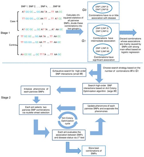 ACO is a successful technique for a non-deterministic polynomial-time hard (NP-hard) combinatorial optimization problem; it has been widely used in GWAS studies [23,39,40]. Basically, the ACO-based method aims to search combinations that can clearly discriminate between the control and case samples within a GWAS dataset. The search space comprises all SNPs and their combinations. The power of ACO-based methods has been shown in detecting two-locus interactions on genome-wide datasets [23,40]. However, these stochastic approaches based on ACO significantly lose their power in detecting high-order interactions. That is because the search space is exponentially increased, and ACO can hardly obtain optimal solutions through positive feedbacks. To reduce the negative effect of the large search space and help ACO obtain the optimal solution, we narrow the search space as the two-locus combinations chosen in the first stage.