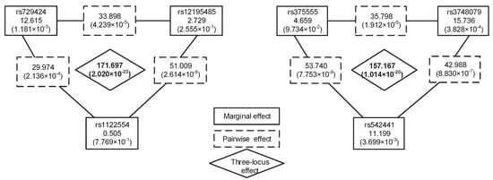 - For a two-locus combination, if both and have strong main effects, a logistic regression model defined by Equation (5) is fitted to measure the additive main effects of them as:If only (or ) has a strong main effect, a logistic regression model defined by Equation (6) is used to measure the main effect in that combination as:Then, the Newton–Raphson method is utilized again to iteratively optimize the corresponding maximum likelihood value of Equation (5) or Equation (6).