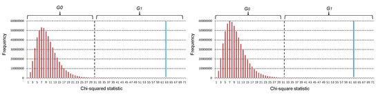 Motivated by these observations, we partition two-locus combinations into two groups, denoted as , , where includes all two-locus combinations that have no or little association with disease, and includes combinations that have intermediate or significant association with disease. The chi-squared test is simple and powerful and can identify SNP combinations associated with disease without considering the disease model [23,34,35], so we resort to the chi-squared test to measure the associations between two-locus combinations and disease. Each two-locus combination is divided into one of these two groups according to its chi-squared statistic. To do such division, we need to derive some thresholds for declaring significance. The details of the setting threshold and grouping two-locus combinations are listed as follows: