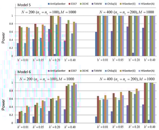 A pure interaction model is usually defined by the penetrance table, whose elements represent the probability of being affected with the disease given the genotype combination. The penetrance values are usually decided by three parameters: disease prevalence , genetic heritability () [44] and MAF. Here, we consider two three-locus pure interaction models. Model 5 is proposed by Culverhouse et al. [44], which yields maximum genetic heritability with no marginal effect for the population penetrance with MAF = 0.5. When the MAF of disease loci is set to 0.5 in Model 3, the loci will have no marginal effect, so we use Model 6 to denote the special case of Model 3. Heritability controls the phenotypic variation of these two models; it ranges from 0.01 to 0.4 and MAF is set to 0.5. We use the software GAMETES_2.0 [45] to generate 100 datasets under different settings for two pure interaction models, in which the sample size N () varies from 200 to 400 and the SNP size is fixed as 1000.