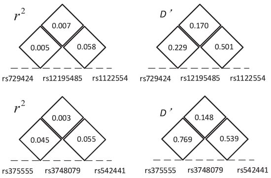 The linkage disequilibrium (LD) between SNPs in the two three-locus combination detected in CD data.