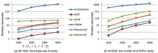 Computational efficiency is another key performance index that needs to be considered in detecting high-order interactions from genome-wide data. We compare the runtime of these comparing methods in detecting three-locus interactions by varying the sample size N and the number of SNPs M. All experiments are conducted on a server with Intel Xeon E5-2678, 256 GB RAM and CentOS 6.5. The recorded runtime of these methods is shown in Figure 7. Figure 7 shows that given a fixed number of SNPs, the runtime of all methods linearly increases with the increase of the sample size. Although EDCF, DCHE and HiSeeker exhaustively analyze all two-locus combinations, their runtimes are smaller than AntEpiSeeker. That is because EDCF, HiSeeker(A) and HiSeeker(E) utilize bitwise computing and store SNP genotype data in a bitwise data structure to achieve great memory efficiency and computing speed [13]. TAMW is also computationally efficient by employing forward selection algorithm. HiSeeker(A) is faster than HiSeeker(E), since exhaustive search is time consuming. EDCF detects high-order SNP interactions only based on selected significant two-locus combinations, whose number is much smaller than that used by HiSeeker, which additionally takes into account two-locus combinations that have intermediate association with disease. Therefore, EDCF is faster than HiSeeker.