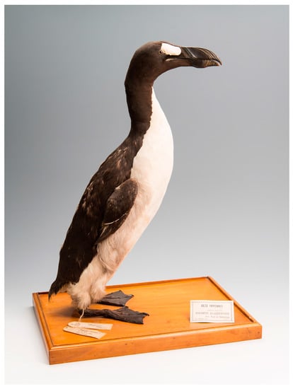 The Great Auk (Figure 1), Pinguinus impennis, Bonnaterre (1790) (traditionally Alca impennis, Linnaeus, 1758), has been described as “perhaps the most curious of all vanished birds” [3]. It was a bird whose life and ultimate extinction has generated ongoing interest, with several scholars dedicating their lives to Great Auk research [3,4,5,6,7]. Even now, 173 years after the death of the last two recorded captured individuals, there are still many unanswered questions concerning aspect of its life-history, evolution, and extinction. One such mystery that surrounds the Great Auk is the whereabouts of the skins from the last documented pair. In order to be able to correlate the phenotype of the last birds with genomic information obtained from the well-preserved organs, and in view of the active role that researchers and research institutions played in pushing the Great Auk towards extinction, it is of relevance to be able to trace these skins.