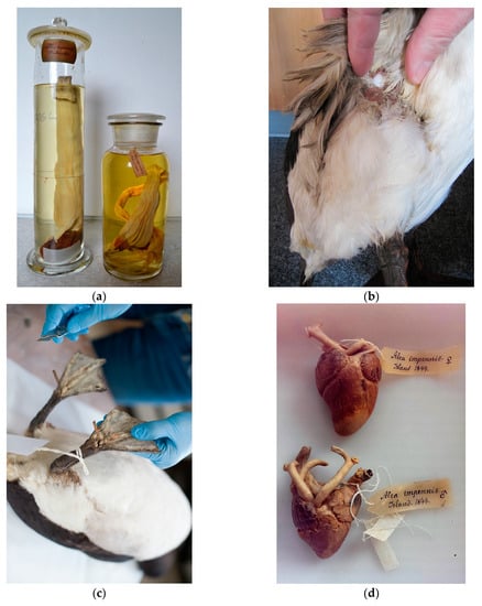 (a) Jars containing the oesophagus from the last two individuals killed on Eldey Island. The oesophagus from the larger jar represents that of the individual labelled male (NHMD153069) (MK131). The smaller jar contains the oesophagus from the female bird (NHMD153070) (MK132) (credit. J. Thomas). (b) Sampling of The Oldenburg Auk (AVE 8086) (MK133) to remove a section of body tissue for DNA extraction (credit. C. Barilaro, Landesmuseum Natur und Mensch Oldenburg). (c) Sampling the toe pad of The Bremen Auk (RKNr. 2392) (MK134) to remove tissue sample (credit M. Stiller, Übersee-Museum Bremen). (d) The hearts from the last two documented individuals. The heart from the female individual has been sampled for this study (top) (NHMD153070) (LastGA2_Heart) (credit Natural History Museum of Denmark).