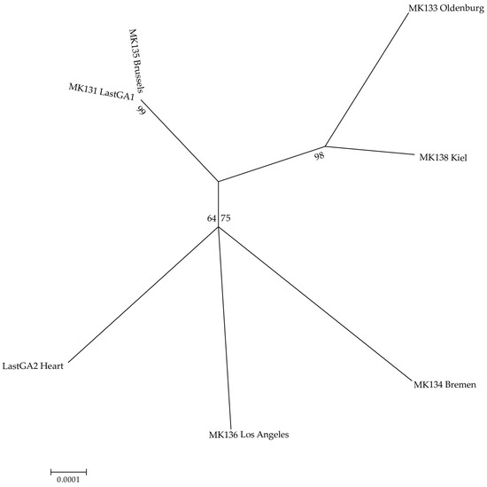 - Guindon, S.; Gascuel, O. A simple, fast, and accurate algorithm to estimate large phylogenies by maximum likelihood. Syst. Biol. 2003, 52, 696–704. [Google Scholar] [CrossRef]
