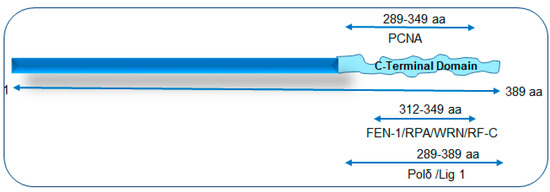 A schematic of NEIL1’s interaction mapping with long patch-base excision repair (LP-BER)/replication proteins to its disordered C-terminal domain. PCNA: proliferating cell nuclear antigen; FEN-1: flap endonuclease 1; RPA: replication protein A; WRN: Werner helicase; RF-C: replication factor C; Polδ: polymerase delta; Lig 1: ligase 1.