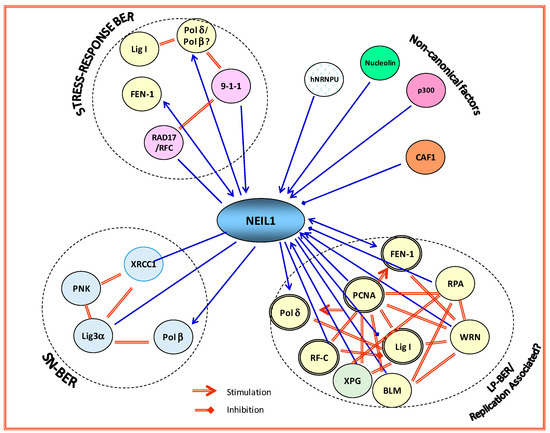 NEIL1 acts as a hub protein in binding to distal partners in BER. NEIL1 forms distinct complexes with single-nucleotide (SN-)BER, long patch (LP-)BER (replication-associated), and other non-canonical proteins, many of which activate its BER activity. RPA inhibits NEIL1 activity in single-stranded (ss)DNA substrates. Binding of nucleolin and p300 are from unpublished data. Polβ: polymerase beta; hNRNP-U: heterogeneous nuclear ribonucleoprotein U; 9-1-1: Rad9–Rad1–Hus1; CAF1: chromatin assembly factor-1; XRCC1: X-ray cross-complementing protein; PNK: polynucleotide kinase; Lig3α: ligase 3 alpha; Polβ: polymerase beta; XPG: Xeroderma pigmentosum Complementation group G; BLM: Bloom syndrome protein.