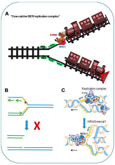 As NEIL1 encounters the base damage in the template strand, it binds to the lesion to flag it, and replication cannot continue. However, binding of the ssDNA template by mammalian ssDNA-binding protein replication protein A (RPA) at the replication fork prevents NEIL1-mediated lesion excision via direct interaction [81]. This is a critical step in pre-replicative BER because if NEIL1 excises oxidized bases and cleaves the template strand in replicating DNA, a one-ended DSB will be generated. Furthermore, we observed that NEIL1 inhibits primer elongation of the RPA-coated template by Polδ in vitro reaction, thereby stalling the replication complex at the lesion site. In addition to lesions like 5-OHU or 5-OHC, which absolutely requires NEIL1’s binding to stall replication, bulkier lesions such as spiro- and imino-hydantoins or TG were shown to block replication. However, as these are NEIL1 substrates, NEIL1 binding might ensure that misincorporation does not occur prior to their repair. The role of NEIL1 in repairing these replication-blocking lesions was indicated by the inhibition of DNA chain growth in oxidatively stressed NEIL1-deficient cells [38].