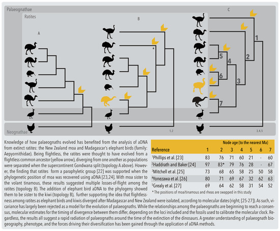 The use of aDNA to inform phylogenies has dominated the field since its inception. In 1992, Cooper et al. retrieved the first avian aDNA from moa (Dinornithiformes) tissue specimens, using a 400 base pairs (bp) partial sequence of the mitochondrial 12S ribosomal RNA (rRNA) gene to reconstruct their phylogenetic relationships with extant ratites. Their results, which showed that the kiwi (Apteryx spp.) was more closely related to Australia’s Casuariiformes (emu and cassowary) than its compatriot, the moa, suggested that New Zealand was independently colonised by the ancestors of moa and kiwi [14]. Since then, numerous studies have built upon these results using aDNA from extinct ratites to investigate the origin and evolution of Palaeognathae (Table 1, Figure 2) Such studies show that a lack of aDNA potentially limits the reliability of associated evolutionary inferences. Avian aDNA has been instrumental in uncovering the phylogenetic relationships of many extinct birds (Table S1), and is helpful for estimating divergence times using molecular dating (e.g., [15,16,17]), both of which have implications for testing biogeographical hypotheses (e.g., dispersal vs. vicariance; [18]) and evolutionary scenarios (colonisation, speciation; [19,20]). For instance, more accurate rates of evolution can be derived from “time-stamped” aDNA sequences, allowing a better estimation of when lineages diverged, and what events may have driven that divergence [21].