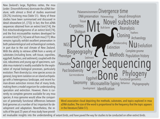 As the only living descendants of dinosaurs and with almost ten thousand extant species, the evolution of birds (class: Aves) is a topic that has captured the interest of scientists for hundreds of years. Birds offer excellent cases for the study of evolution and speciation, particularly in island ecosystems—the most famous example being that of Darwin’s Galápagos finches, which were instrumental in the development of his theory of evolution by natural selection. Birds are also of significant cultural and economic importance to people worldwide; their remains have been found in archaeological assemblages throughout history [1]. While birds are the most biodiverse group of terrestrial vertebrates [2], it is estimated that, according to the International Union for Conservation of Nature (IUCN) Red List of Threatened Species, some 147 species of bird have become extinct in recent times, and a further 362 species are currently endangered. Locations such as Hawai’i have lost approximately half of the endemic avifauna that was present before human arrival to these islands 1600 yBP, with an additional 20% disappearing in historic times [3]. Birds are particularly vulnerable to extinction because they are typically large and have highly specialised diet and habitat preferences; thus, birds (particularly flightless birds, of which there are about 60 extant species) are targeted for food, feathers, eggs, etc., and are sensitive to disturbances to their environment [4]. As avian conservation becomes increasingly important (and as the available funding for it becomes increasingly stretched), understanding the mechanisms, both natural and anthropogenic, that have shaped avian evolution and extinction remains key. The analysis of avian ancient DNA (aDNA; defined here as DNA extracted from fossils, artifacts, and sediment, as well as tissue from extinct birds) is one approach that can be used to achieve this.