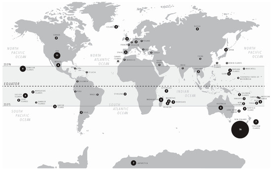 For the majority of birds, their ability to fly means that their bodies are small and their bones are hollow; this makes them fragile and less likely to be preserved in the fossil record compared with other animals or flightless birds [66]. In addition, volant species are underrepresented in typical pit-fall deposits because they can fly out [67,68]. As such, most aDNA studies are conducted on large or flightless birds (or both). In fact, over half of the avian aDNA studies conducted in New Zealand are on moa (Figure 3). Large and flightless birds are also more prone to extinction than small, volant birds because, among other things, they have long generation times (and therefore are slower to adapt to selection pressures) [69], are susceptible to predators because they cannot fly away, or suffer from “predator naïvety” [70]. For this reason, the distribution of avian aDNA studies is skewed towards island species (Figure 4). Although island ecosystems offer an opportunity to tease-apart the effects of anthropogenic impacts and climate change, in absolute terms, the diversity of their avifauna is lower than in continental ecosystems: for instance, few studies have been conducted in South America, despite Colombia, Peru, and Brazil being the top-three most bird-rich countries in the world, with over 1800 species each [2]. In contrast, New Zealand has approximately 200 bird species [71], fewer than Australia (with over 800 [72]), yet almost 50% of the avian aDNA studies are on New Zealand species (Figure 4).