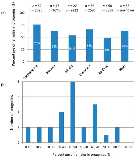 Variations in female percentage in progenies of Armadillidium vulgare females carrying the f element at different population levels. (a) Variation among six natural populations (data from [59,62]); n is the number of progenies, while i is the total number of individuals. The locations of the populations were the United Kingdom (Northampton), the Canary Islands in Spain (Marazul), and France (Moulis, Camarade, Ile d’Yeu and Niort). The average female percentage across the six populations is 62%. (b) Variation within a single population. Distribution of 28 progenies from females sampled in Niort, France (data from [62]), according to female percentage.