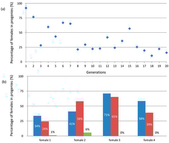 Variation in female percentage in progenies of Armadillidium vulgare females carrying the f element at the genealogical level. (a) Variation in an isofemale line across 20 generations (unpublished results from our laboratory line WXf from 1990 to 2010). (b) Variation in three successive progenies of four females (1–4) mated with single males (data from [58]). The first, second and third progenies of each female are shown in blue, red and green, respectively.