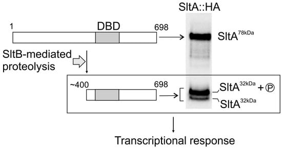 Proteolytic processing of SltA in Aspergillus nidulans. The full-length SltA78kDa form is proteolytically cleaved by SltB to render a truncated, active form of 32 kDa (SltA32kDa). This form comprises the DNA-binding domain (DBD) plus the poorly conserved C-terminal region, and is phosphorylated (low mobility SltA32kDa band). Shown is an immunodetection of SltA forms tagged at the C-terminus with three copies of the hemagglutinin (HA) tag, SltA::HA for brevity. Modified from [6].